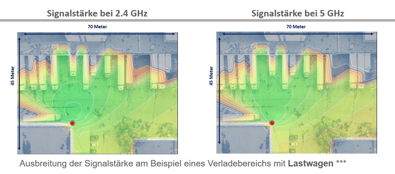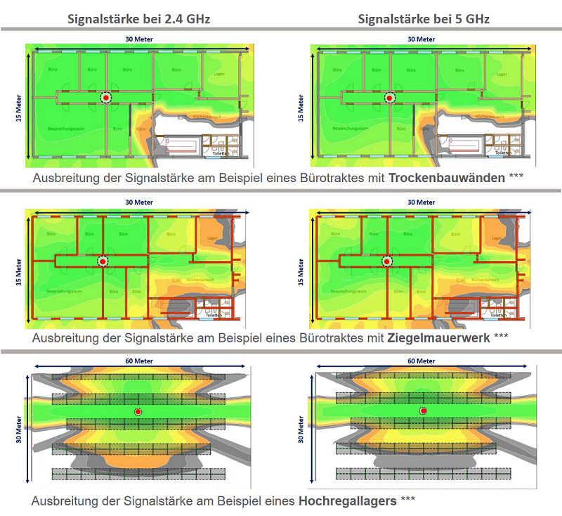 ***Diese Grafiken zeigen die Ausbreitung der Signalstärke im Rahmen standardisierter Dämpfungswerte bei Wänden und Störquellen gemäß der jeweiligen Materialbeschaffenheit. Abweichungen bei der Signalausbreitung sind je nach Bausubstanz möglich.