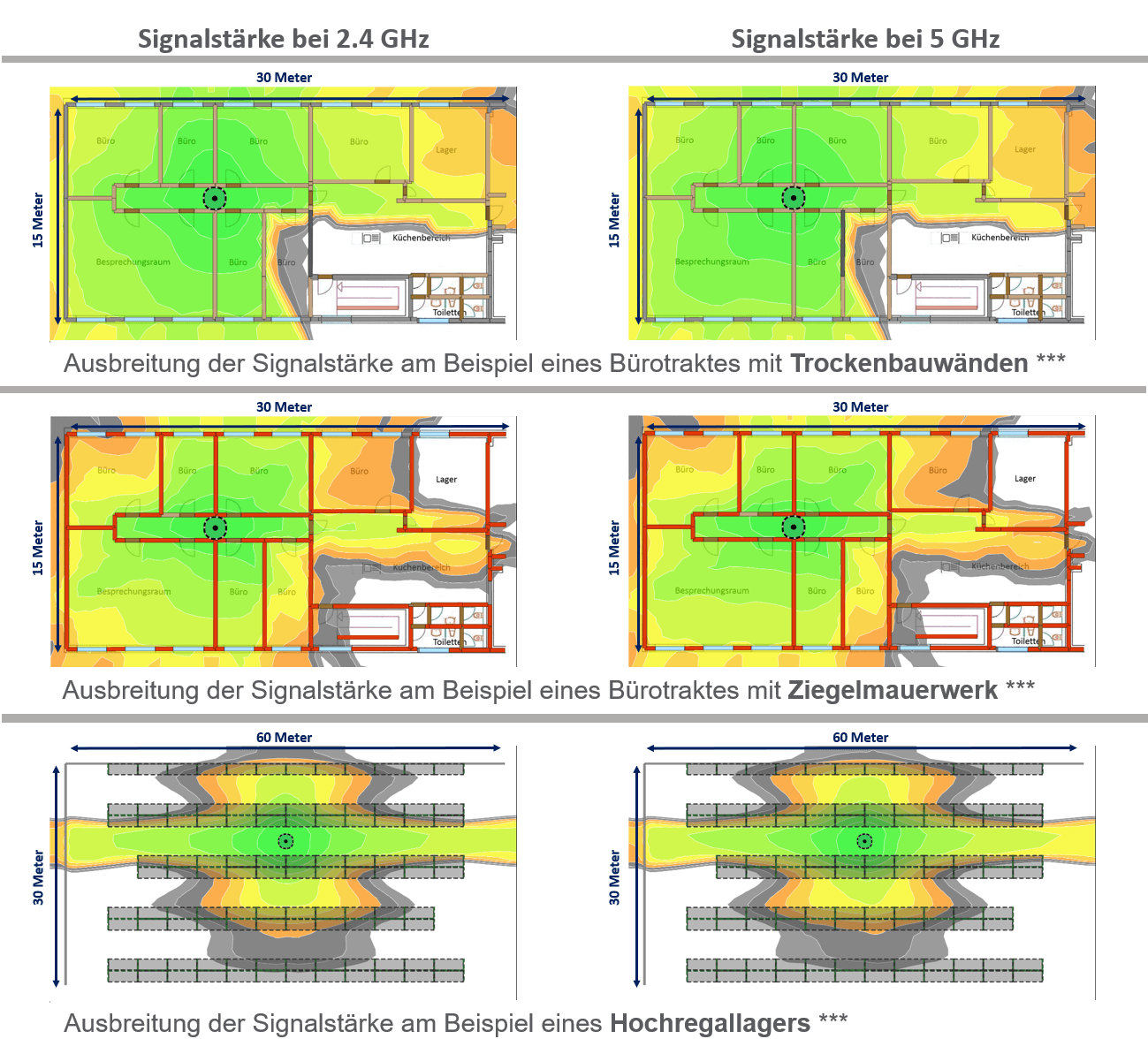***Diese Grafiken zeigen die Ausbreitung der Signalstärke im Rahmen standardisierter Dämpfungswerte bei Wänden und Störquellen gemäß der jeweiligen Materialbeschaffenheit. Abweichungen bei der Signalausbreitung sind je nach Bausubstanz möglich.